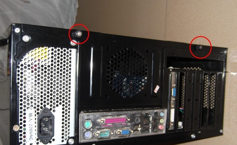 1、首先拔掉主机后面所有的线路,然后拧开旁边的两个大螺丝,打开机箱后盖;