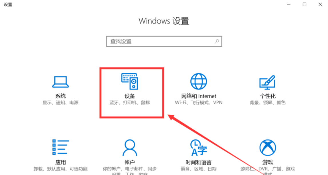 1,点击桌面“开始”——>“设置”,选择页面中的“设备”点击打开,如图下所示;