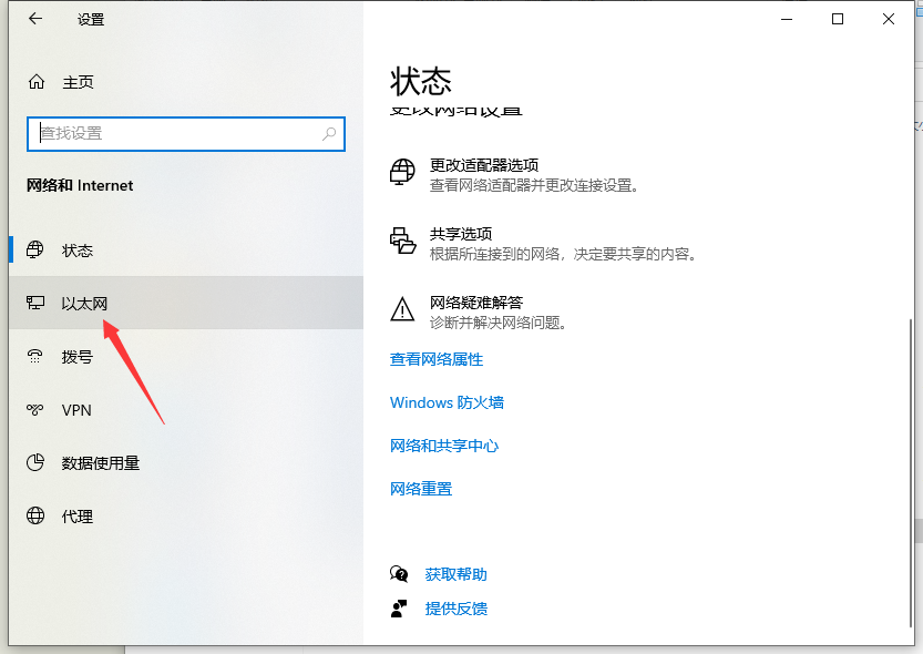 2、在打开的网络和Internet设置窗口,点击左侧边栏的的“以太网”菜单项。