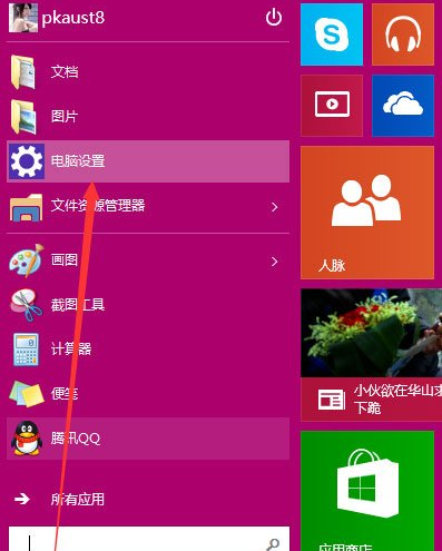 1、点击下方的开始菜单,然后再点击弹出菜单里的“电脑设置”;