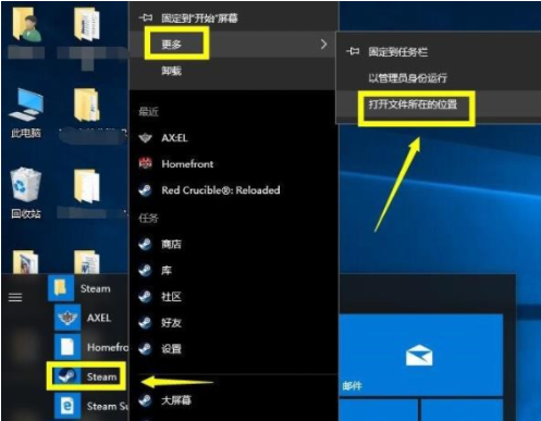 1、点击左下角开始,找到steam点击“更多”,选择“打开文件所在的位置”。