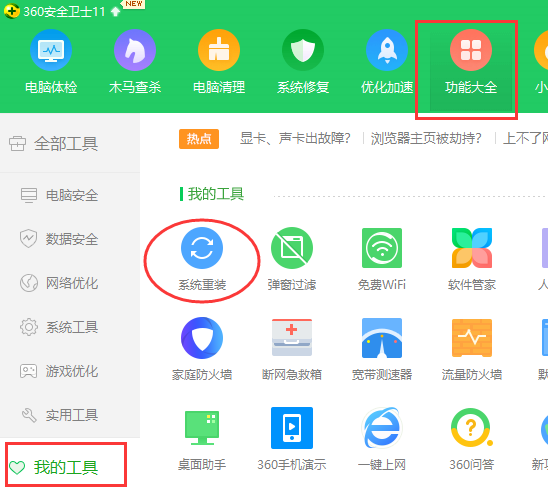 1、打开360安全卫士,点击界面上方的功能大全,左侧的我的工具一栏中找到系统重装,添加【系统重装】