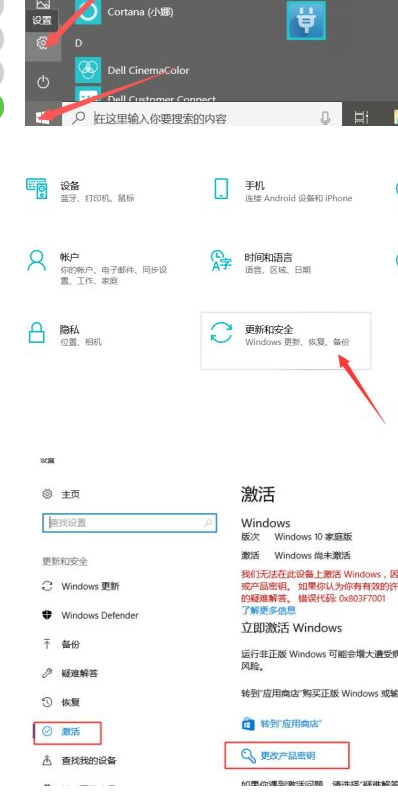 3.我们知道了以上的密钥,我们就可以进行激活了,我们首先打开设置,在进入更新与安全,然后点击激活,然后我们点击更改,输入以上的就可以了。