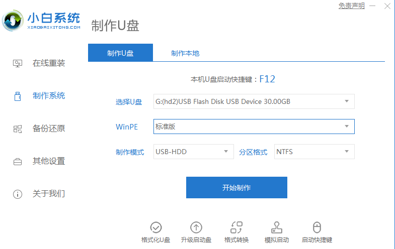1.我们先找一台可用的电脑,在电脑上下载安装小白一键重装系统工具插入8g以上的空白u盘,选择u盘重装系统模式,点击开始制作。(注意u盘里面的重要资料先备份)