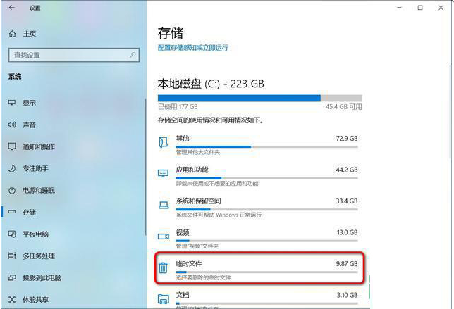 2、在“本地磁盘C:”部分下,单击“临时文件”部分。