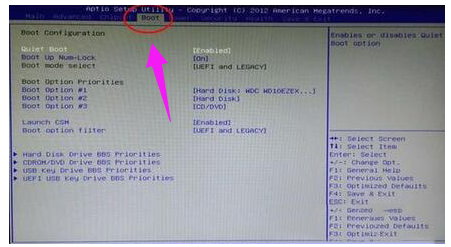 2、boot启动选项下方可以看到有“LEGACYonly”、“UEFIonly”和“UEFIandLEGACY”三种选项,选择uefi选项即可,按下F10保存。