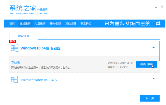 1.首先电脑上下载安装系统之家一键重装系统工具并打开,选择需要安装的win10系统,点击安装系统。(安装前注意备份重要信息,关掉电脑上的杀毒软件,避免被拦截)