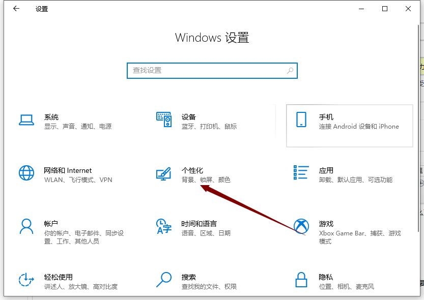 1、我们在Windows设置界面中,我们点击“个性化”,如下图所示。
