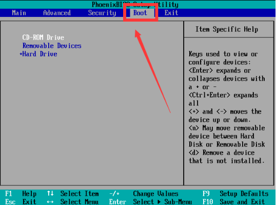 将光标移动到boot,然后找到u盘的选项,removeble devic,是可移动设备的意思。
