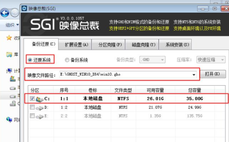 4.在新弹出的界面中点击还原系统,然后点击C盘,勾选勾选【执行完成后重启】,最后点击【执行】,进入下一步。