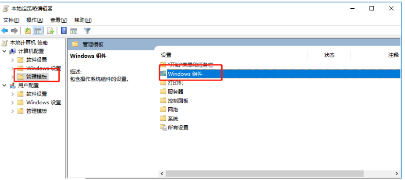 3、找到计算机配置下的【管理模板】然后找到设置下的【Windows组件】。