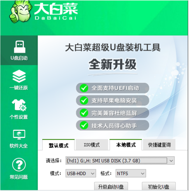 1、打开大白菜超级U盘装机工具,点击主界面的【U盘启动】模块,然后选择【默认模式】。