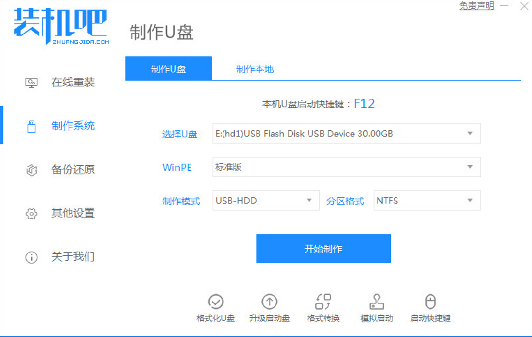 1、电脑开不了机的话,先在一台可用的电脑下载安装好装机吧一键重装系统软件并打开,插入一个 8GB 以上 U 盘,在制作系统中点击开始制作。