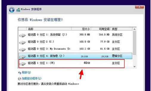 5、再下来这一步很重要,接下来需要选择Win10安装路径,这里需要选择安装到最开始Win7创建的新分区,这里需要选择H盘中,然后再点击“下一步”即可,如下图所示。