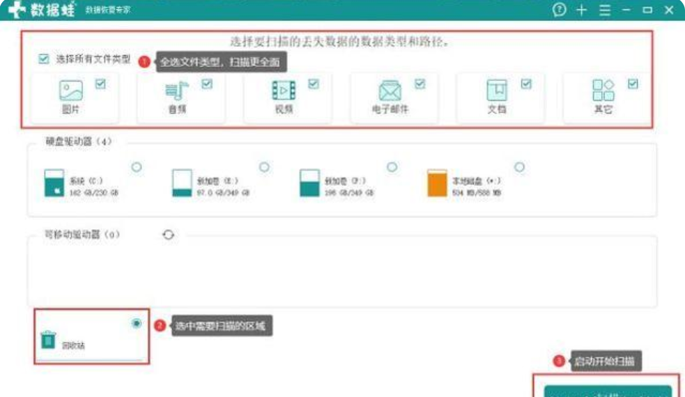 数据蛙恢复专家作为回收站文件恢复工具之一,该恢复软件具有强大的数据恢复功能。推荐数据蛙恢复专家作为回收站文件恢复工具还主要是因为该软件使用简单,支持使用。在功能方面:该软件支持恢复清空的回收站的文件、同时也能支持因误删除、格式化、系统故障等导致丢失的数据;不仅win10电脑的回收站,同时也可以兼容Windows7/8/11和MacOS系统。在数据类型方面,基本上电脑上的文件,都可以支持,如各种常见格式的压缩文档、工作文件、视频、照片、音乐、电子邮件等等,都不在话下。具体回收站的恢复操作介绍如下:
