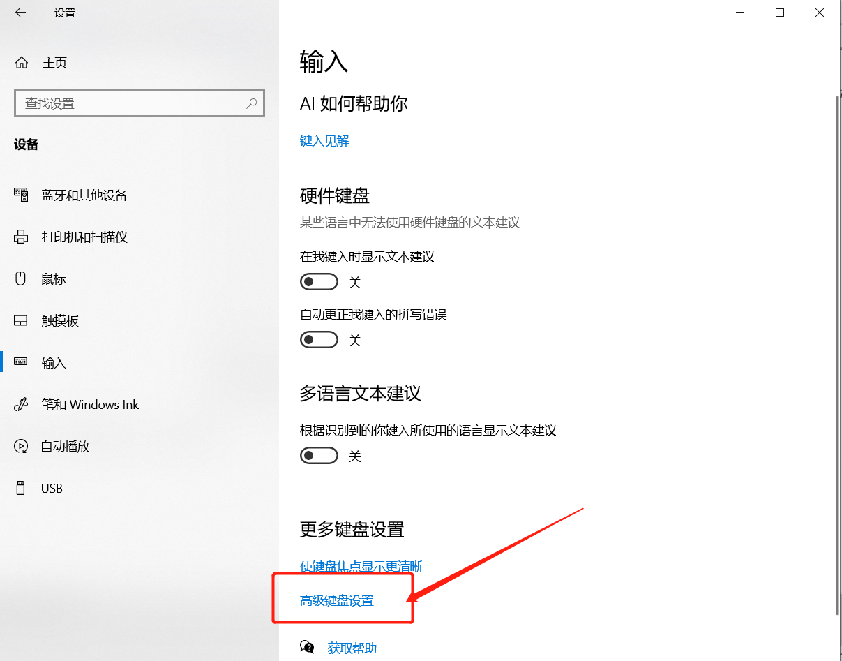 4、然后再在进入的页面中找到”高级键盘设置“的选项,点击进入。