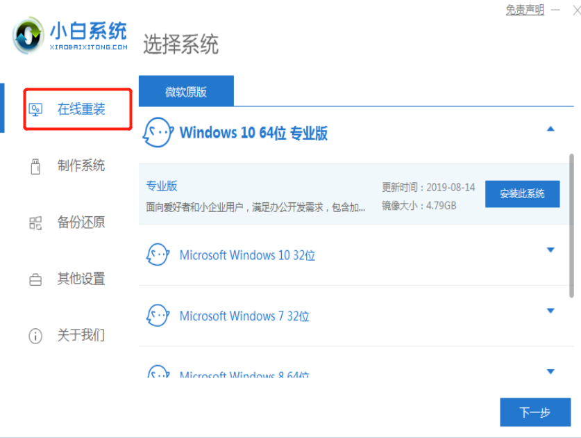 1.下载小白一键重装系统 v2290软件,下载后打开,点击到一键装机界面,选择“在线重装”;