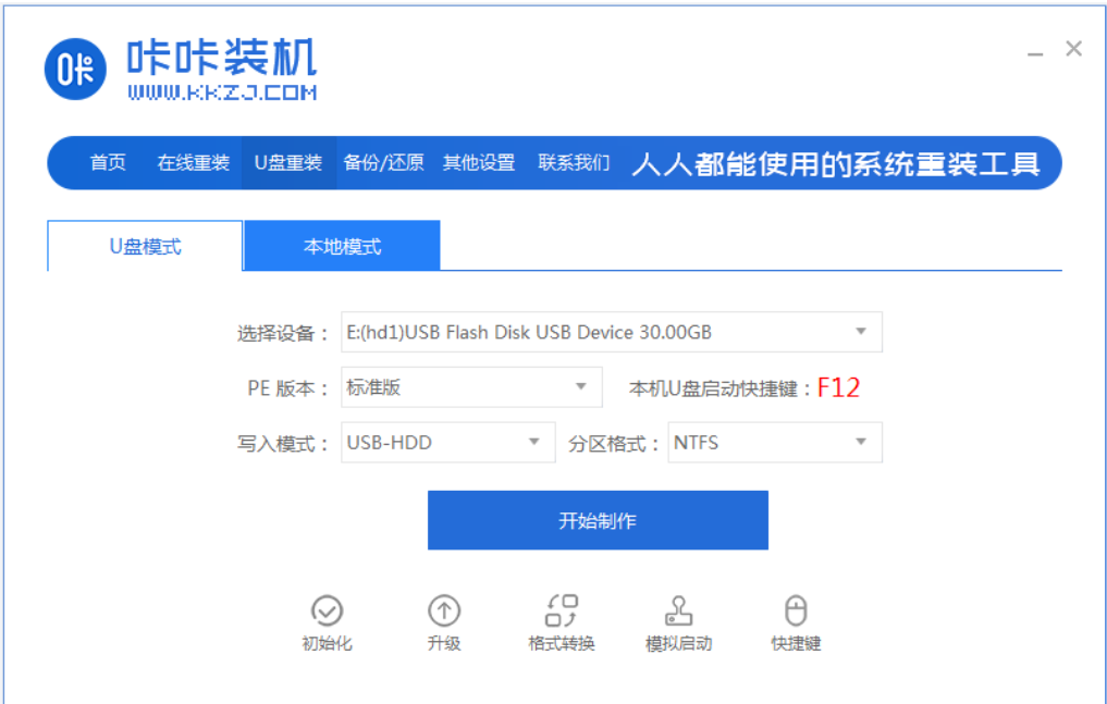 1、先在可联网使用的电脑下载安装好咔咔装机一键重装系统工具并打开,然后插入一个8g以上的空白u盘,选择u盘重装系统模式点击开始制作启动盘。