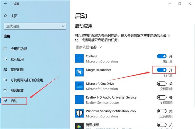 2、进入应用设置,左侧导航点击“启动”,然后右侧的应用有启动的,开关点击关闭。