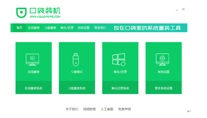 1、下载并运行口袋装机软件,点击在线重装系统。