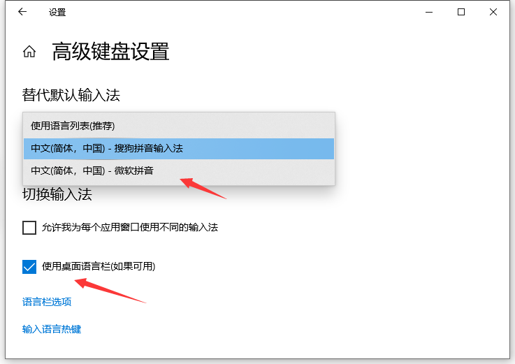 3、在新界面就可以修改默认输入法,并勾选“使用桌面语言栏”选项即可调出win10电脑输入法。