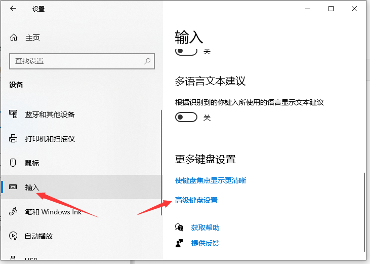 2、左侧单击“输入”,右侧点击“高级键盘设置”。