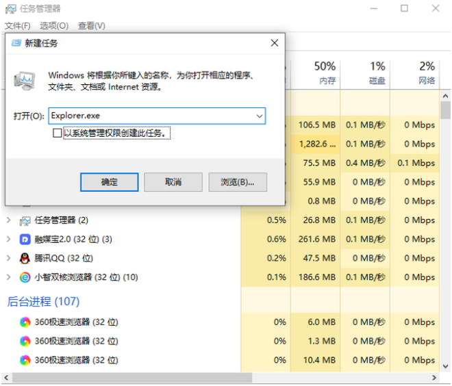 2、在打开的窗口中点击文件,选择运行,然后输入:explorer.exe,在以系统管理权限创建此任务打勾,然后确定。这时系统桌面图标恢复。