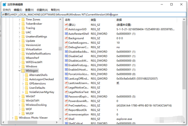 5、鼠标左键单击:Winlogon,找到Shell。然后左键双击Shell,如果Shell的数值数据为:explorer.exe,则是正确的,如果不是explorer.exe,则把Shell的数值数据更改为:explorer.exe,最后点击确定重启即可。