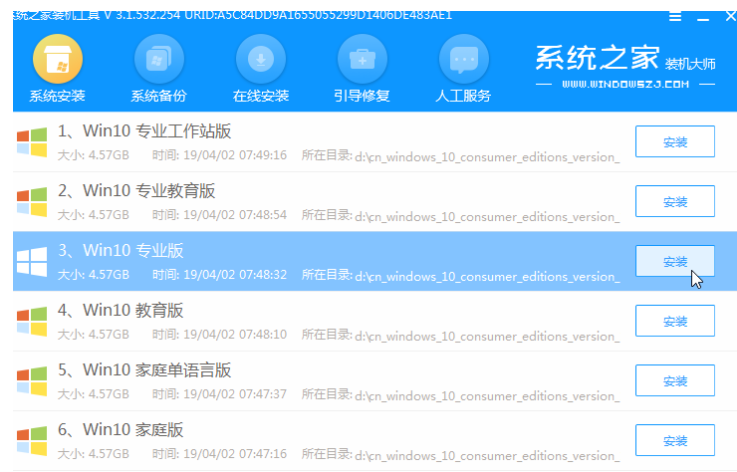 6、在pe系统内,打开系统之家装机工具,选择win10系统安装到系统盘c盘。