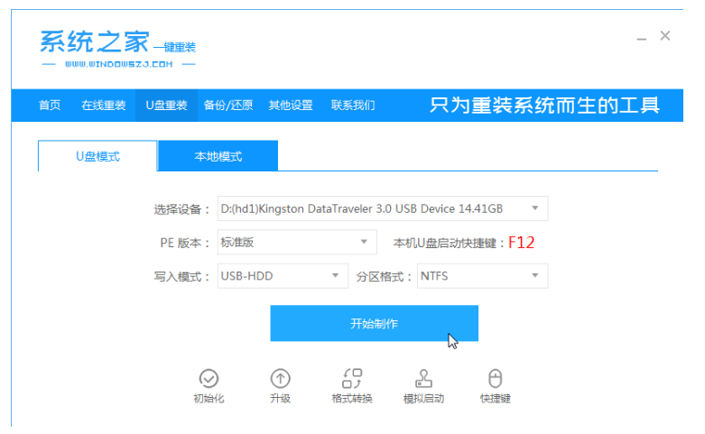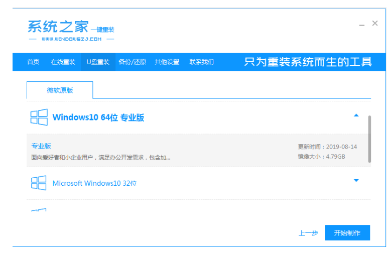 1、首先插入U盘到电脑并打开系统之家一键重装系统软件,进入u盘重装界面后,点击开始制作。