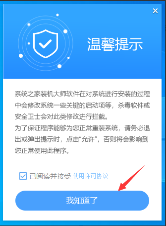 1、下载按照系统之家装机大师并打开,点击“我知道了”进入软件主页面。