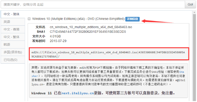 6、然后点击右侧的详细信息,复制红色框中详细的ed2k地址。
