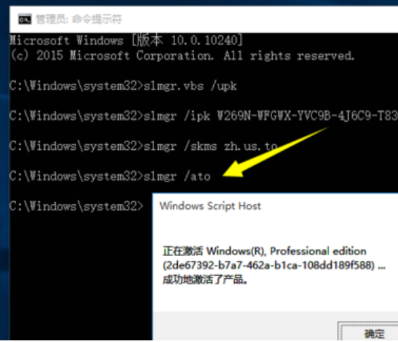5.最后输入命令:slmgr /ato,回车键后将弹出“成功的激活了产品”的提示窗口,完成激活。