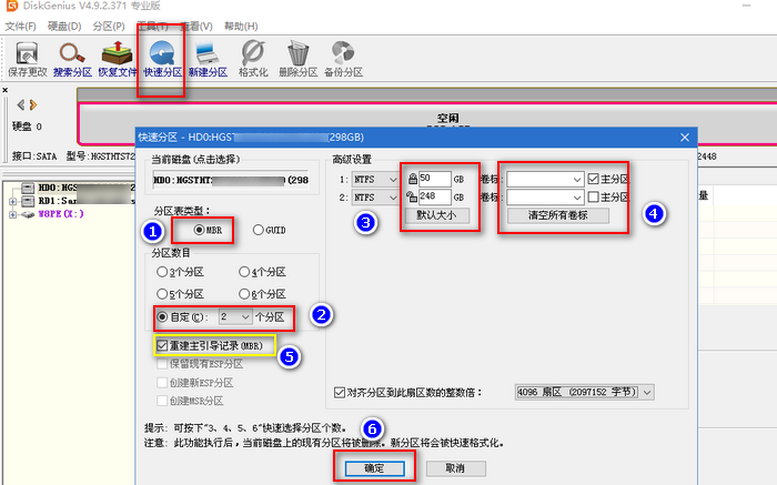 4、然后弹出提示都默认,点击【确定】。一会设置完成关闭分区工具。