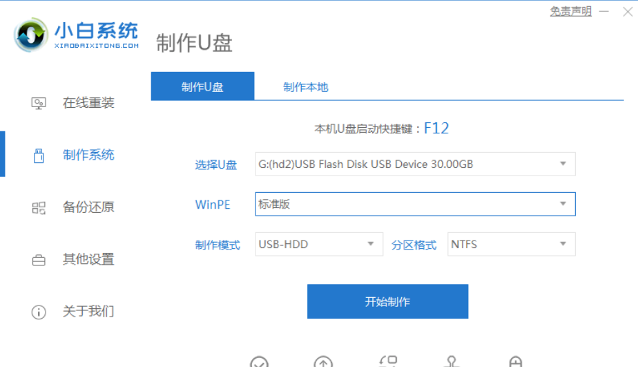 1、下载小白一键重装系统工具制作U盘启动盘(下载地址:http://www.xiaobaixitong.com ),插入U盘,选择U盘模式,点击一键制作U盘启动盘。