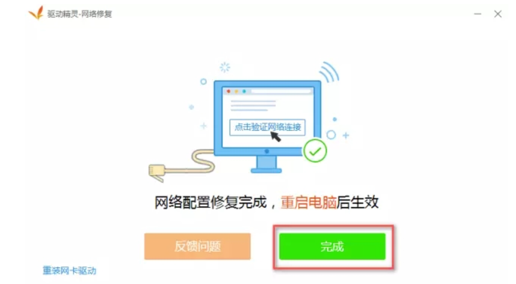 6、修复完成点击完成并重启电脑,就可以发现网卡驱动已经成功修复。
