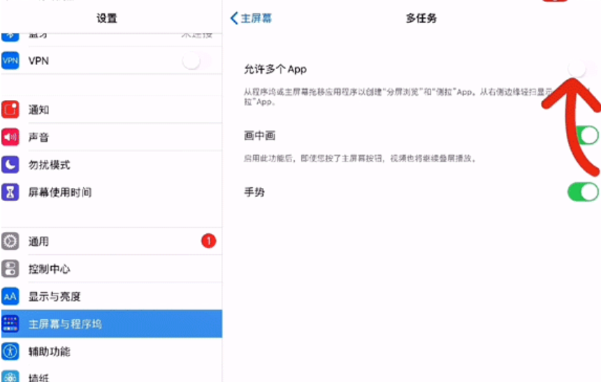 2、先点击多任务,然后将允许多个APP的开关打开。
