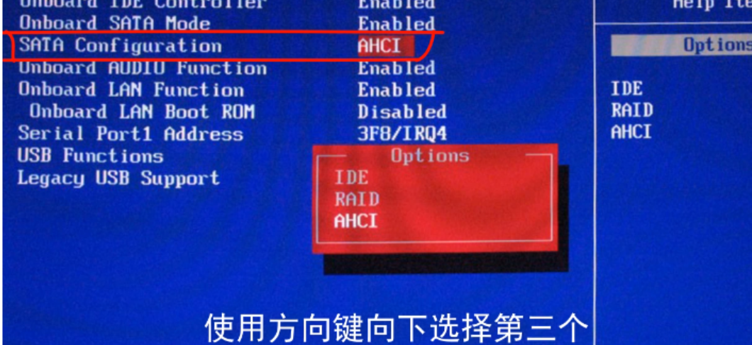 3、弹出"options"窗口,选择”IDE"回车确认,然后按F10保存设置,重新启动即可。