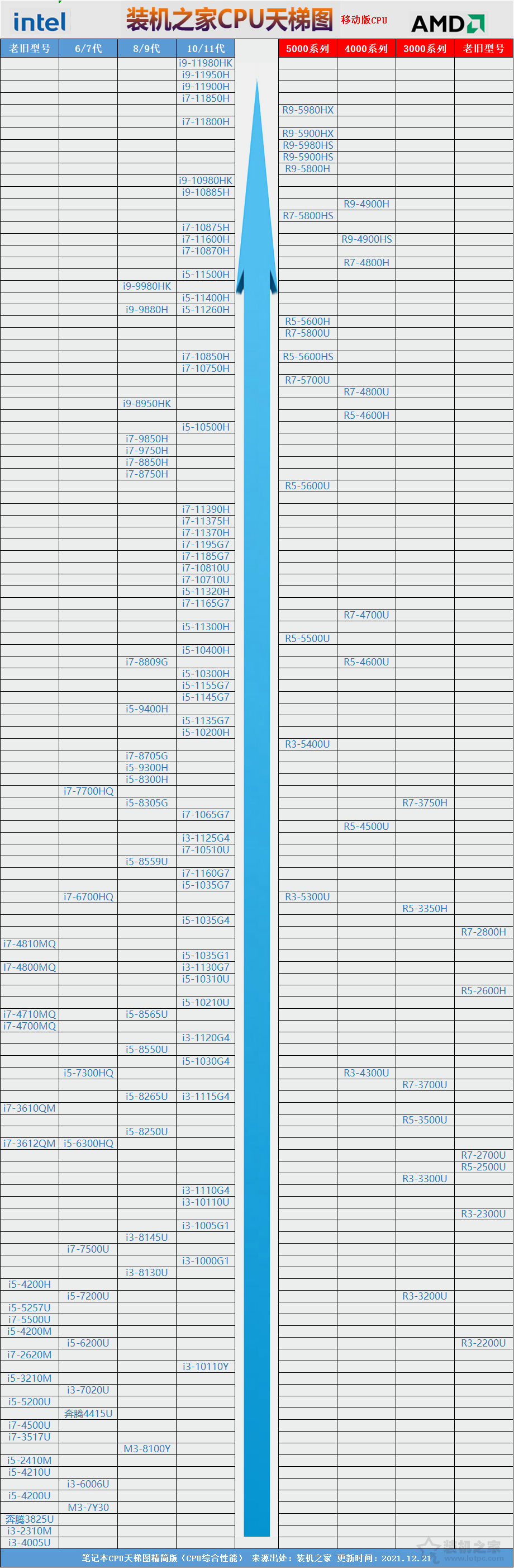 笔记本CPU天梯图一、笔记本CPU性能天梯图笔记本CPU天梯图精简版主要是近几代产品,intel CPU包括了三代、四代、五代、六代、七代、八代、九代、十代以及全新十一代产品,目前选购笔记本建议的是十代和十一代产品,而AMD CPU主要是锐龙一代、二代、三代以及全新的四代5000系列,目前主流产品主要是锐龙5000系列,具体笔记本移动版CPU天梯图如下。