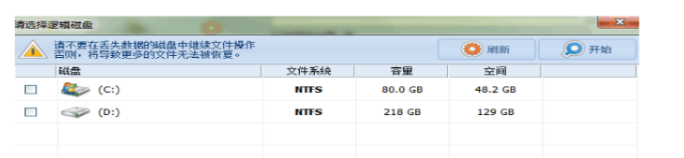 4.勾选所要恢复文件所在的盘符,点击开始