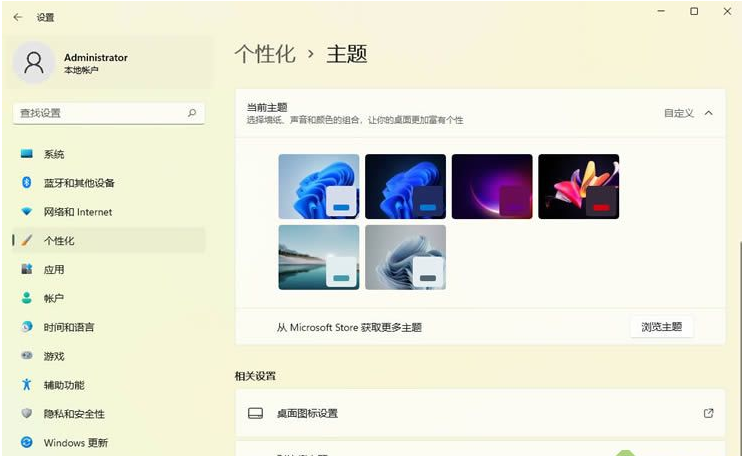 2、在个性化里面下拉找到主题点击,然后打开桌面图标设置。
