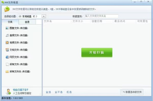 1.下载360数据恢复大师后,打开360文件恢复器并选择需要恢复文件的磁盘;?如果需要还原U盘等移动设备,请先将U盘连接到计算机,然后等待计算机显示“可移动设备”,显示图标。?然后单击“开始扫描”,然后等待磁盘扫描结束。