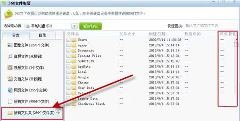 2.扫描结束后,360文件恢复功能将显示丢失的文件。 有四种类型的可恢复性:高,较高,差和较差。 当然,高和高文件的可恢复性更好,另一个是文件夹的可恢复性为空。 在这种情况下,绝对可以恢复该文件夹,但是该文件夹内的文件可能已被擦除。 写入,还原文件夹后,您可能无法找到所需的文件。