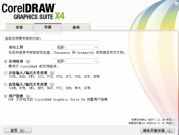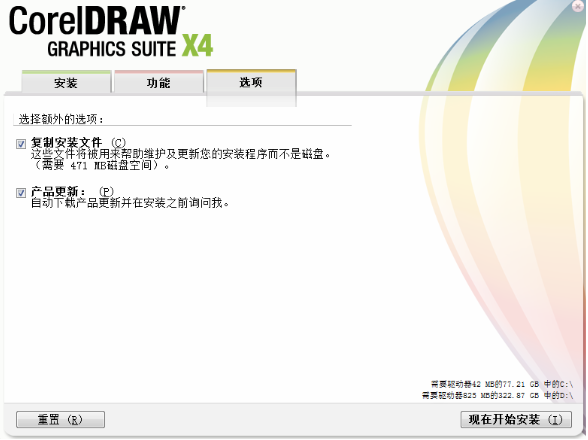 8.设置完功能界面后,单击“选项”进入该界面设置。这个界面只有两个选项,根据自己需求选择。设置后我们单击【现在开始】安装即可。