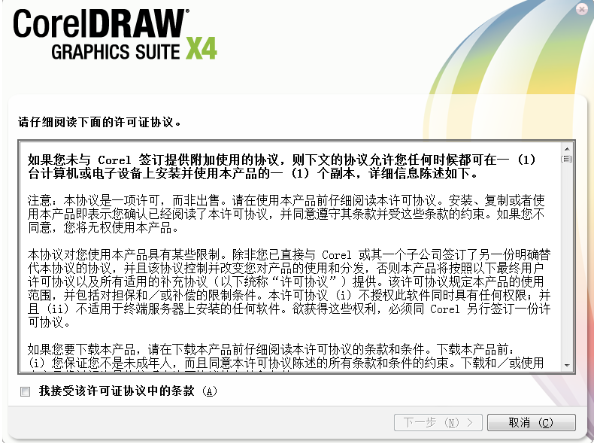 3.加载完毕进入到CorelDraw X4的安装协议界面,同意协议后我们单击【下一步】继续安装。