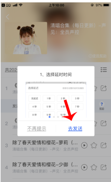 5、选择延迟发送秒数,再点击左下角麦克风图标。
