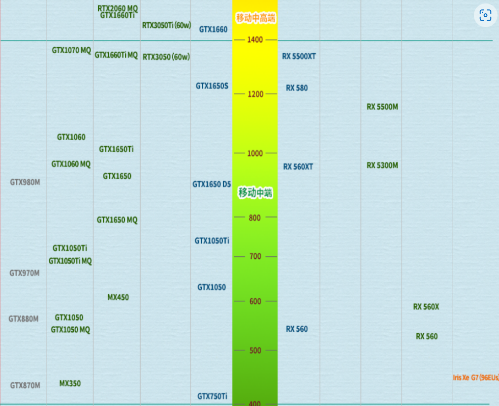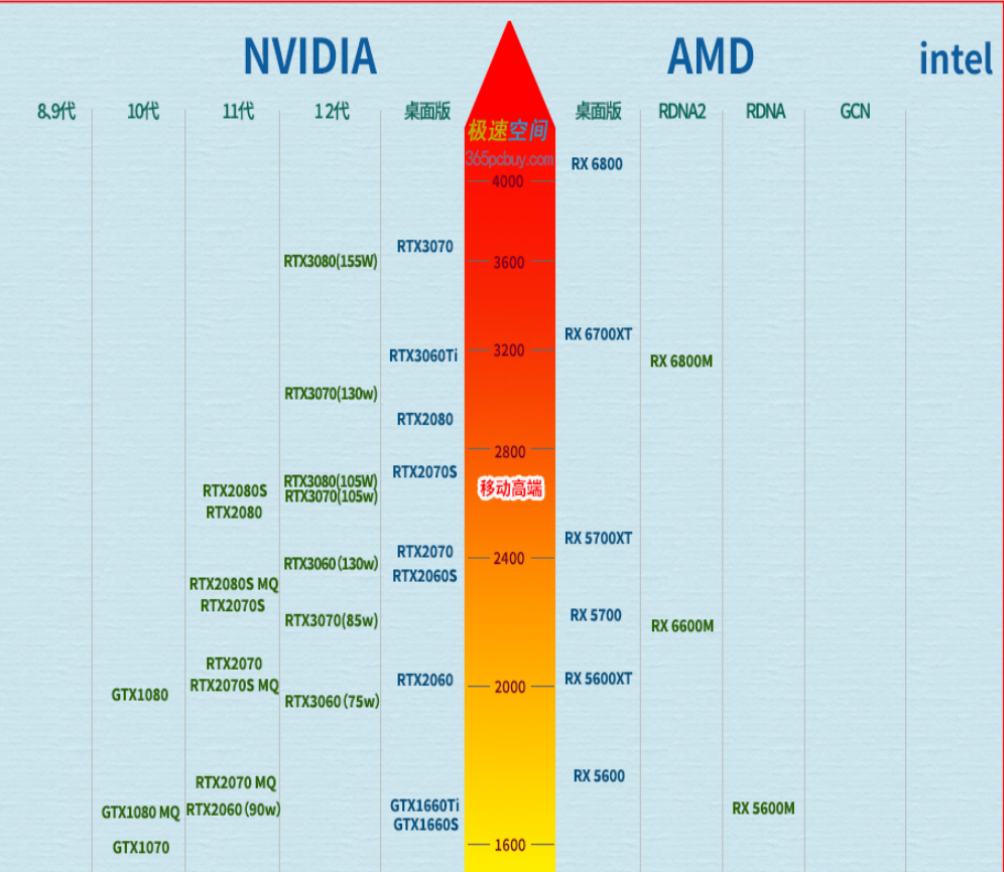 下面是花飞羽落版本的移动平台显卡天梯图,收集的笔记本电脑显卡型号比较全面,几乎囊括了所有型号的移动显卡。包括nvidia独显,amd独显,intel核显和apple芯片,括号内的表示显卡功耗。目前笔记本显卡排行天梯图排在前二十名的显卡型号依次是: