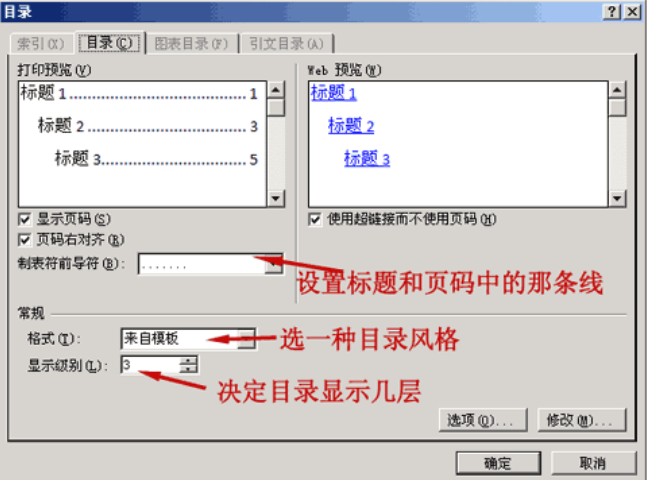 2、这里有些选项可以供选择。(主要的就三个:格式里面有多种格式供您选择,像一套套的模板,使用方便。目录标题和页码间的那条线可以用制表符前导符设置。显示级别一般不需要更改,精确到三层足够了。)