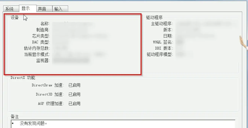 在DirectX诊断工具的“系统”和“显示”选项卡下即可查看电脑配置