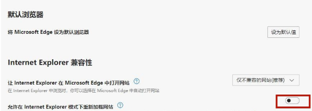 3.将其中的“允许在internet explorer模式下重新加载网站”勾选打开,并且重启浏览器;